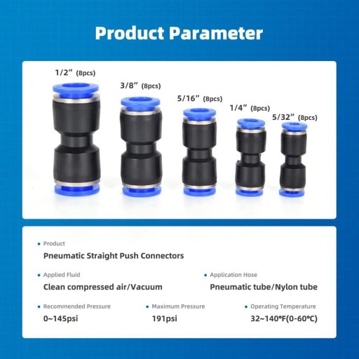 [Wysoka wydajność]: Złącze pneumatyczne, zalecane ciśnienie 0-145 psi; maksymalne ciśnienie 191 psi; temperatura robocza 32-140 fahrenheita (0-60 stopni).