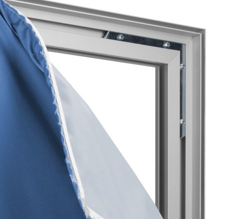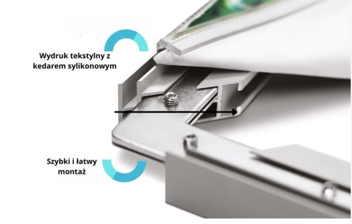 Grafika tekstylna, z wszytym językiem sylikonowym, pozwala na lekki, intuicyjny montaż na zasadzie wsunięcia go w nutę profilu aluminiowego.