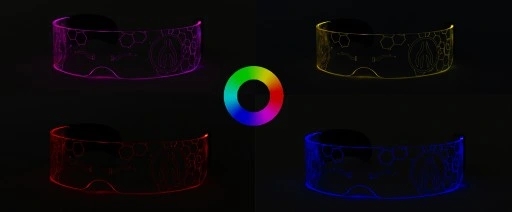 Sterowanie diodami LED - Po obu stronach okularów znajduje się mały przycisk. Ten przycisk kontroluje kolor światła LED. Naciśnij i przytrzymaj przycisk, aby wyłączyć. Pamiętaj, że jeśli chcesz, każda strona okularów może mieć inny kolor.
