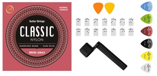 STRUNY DO GITARY KLASYCZNEJ Z ZAPASOWĄ STRUNĄ D4 W KOMPLECIE + 6 KOSTEK RÓŻNEJ GRUBOŚCI