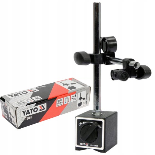 Profesjonalny statyw magnetyczny YT-72460 do czujników zegarowych YT-72450 i YT-72453. Posiada przegub sprężysty dla dokładnego pozycjonowania czujnika zegarowego na mierzonym elemencie. Centralne blokowanie pokrętłem jednocześnie środkowego i górnego przegubu. Podstawa magnetyczna z rowkiem pryzmatycznym od spodu. Duża siła przyciągania zapewnia stabilne i pewne połączenie z elementami metalowymi - odpięcie elementu realizowane jest specjalnym pokrętłem.