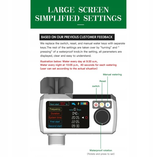 4. Duży ekran: ten timer nawadniania przyjmuje duży ekran, który wyraźnie wyświetla szczegóły wszystkich funkcji.