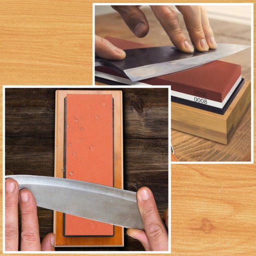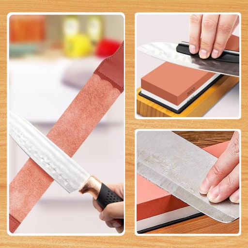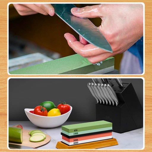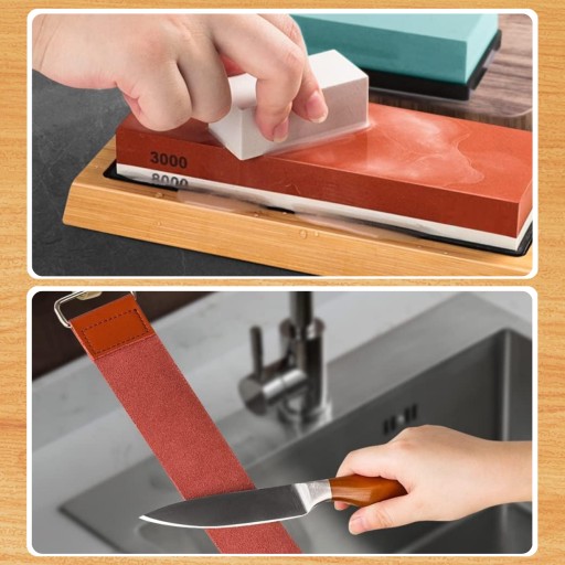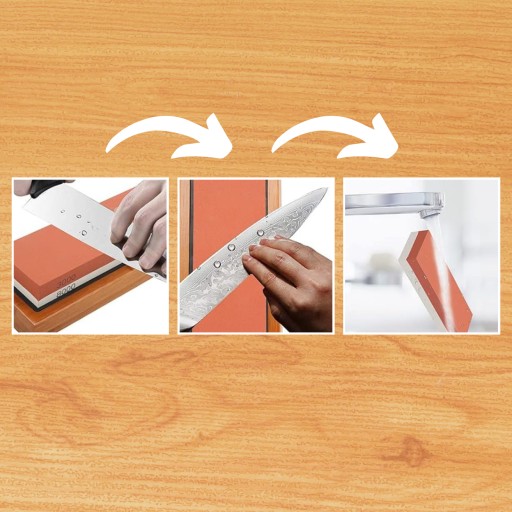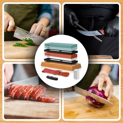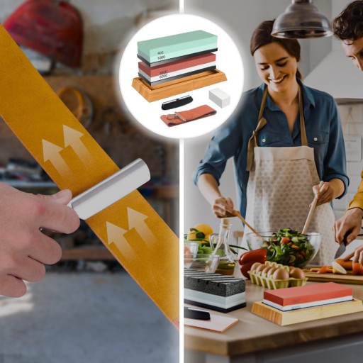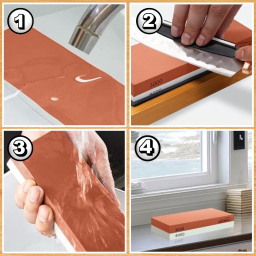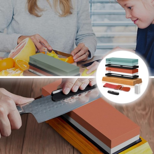- PROSTA OBSŁUGA - Instrukcja obsługi pokazuje, jak używać poszczególnych narzędzi. Kamień do ostrzenia noży wykorzystuje wodę do ostrzenia, a nie drogie oleje do ostrzenia/gładzenia. Wystarczy zmoczyć kamień przed użyciem i w razie potrzeby posmarować go dodatkową wodą.