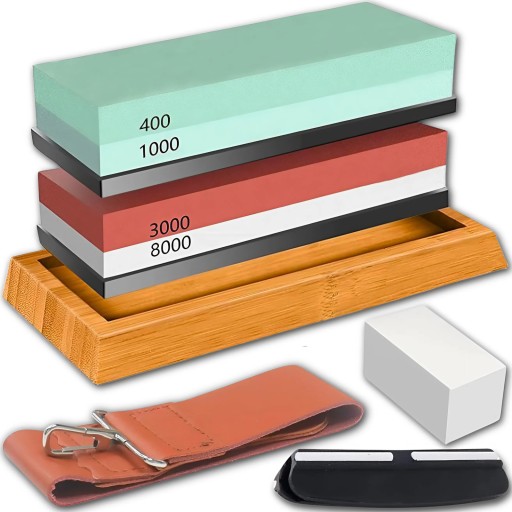 - WYSOKA JAKOŚĆ - Kompletny zestaw kamieni szlifierskich z podstawą bambusową oraz antypoślizgową wyściółką, prowadnicą kątowa, kamieniem do spłaszczania, silikonowym uchwytem oraz skórzanym paskiem. Produkt jest trwały i spełnia wszystkie normy.