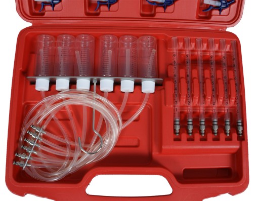 Zestaw menzurek umożliwia zbadanie sprawności działania wtryskiwaczy za pomocą określenia ilości nadmiaru paliwa 'oddawanego' przez wtryskiwacz poprzez króciec 'przelewu' wtryskiwacza.