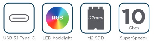 Obudowa jest kompatybilna z dyskami M.2 NVMe o szerokości 22 mm, co czyni ją uniwersalnym rozwiązaniem dla większości popularnych modeli SSD dostępnych na rynku. Dodatkowo, obudowa posiada efektowne podświetlenie LED RGB, które nie tylko nadaje jej nowoczesny wygląd, ale również pozwala na personalizację, dzięki czemu można dostosować kolory do własnych preferencji bądź estetyki stanowiska pracy.