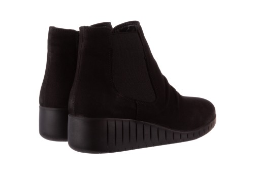 Wkładka wykonana ze skóry naturalnej w kolorze czarnym. Wyściółka z delikatnie ocieplanego materiału w kolorze czarnym. Botki na wygodnym 4,5-centymetrowym koturnie. Obuwie wsuwane, posiada wszytą gumę ułatwiającą zakładanie obuwia. Klasyczna cholewka o prostym kształcie. Modna, gruba podeszwa z faktorem. Przód cholewki modnie marszczony.