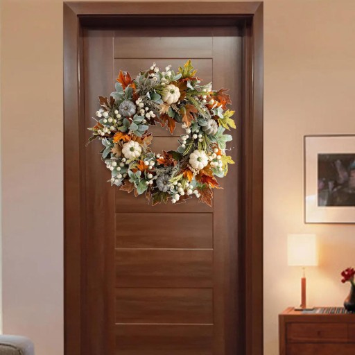 Materiał: jesienny wianek wykonany ze sztucznego materiału, doskonały do dekoracji drzwi, okien, ściany i kominków.