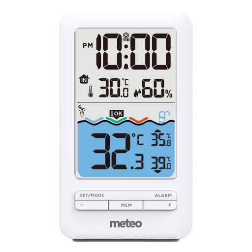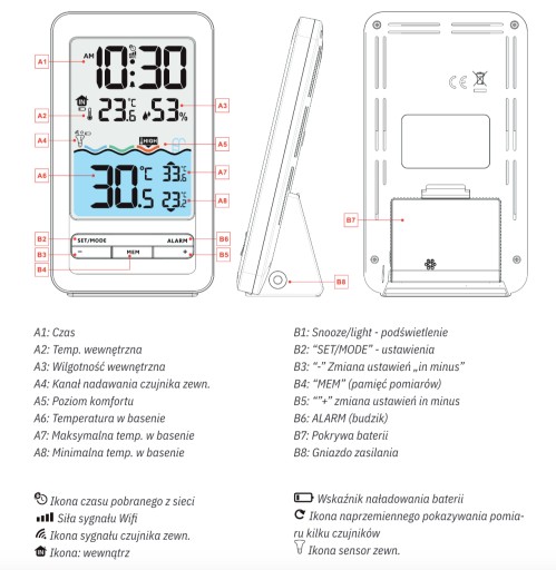 - Zakres zastosowań: mierzenie temperatury i wilgotności w pomieszczeniu, wskaźnik komfortu, mierzenie temperatury wody, zegar, budzik