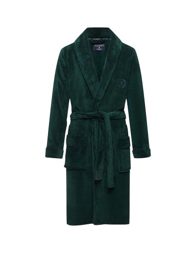 Ciemnozielony szlafrok męski UMPIRE, wykończony granatową lamówką i ozdobiony logo na lewej piersi, sięga do kolan i ma luźny, wiązany w pasie krój.