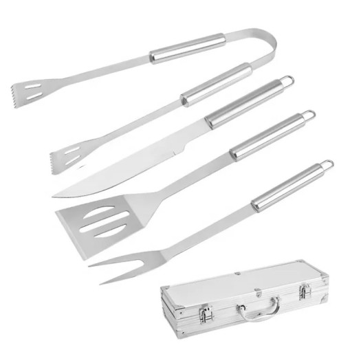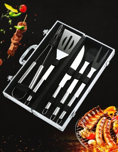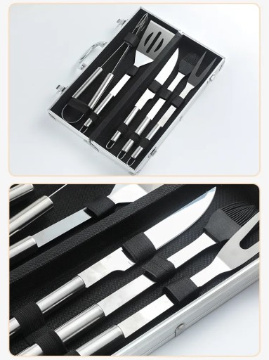 Zestaw akcesoriów do grillowania, wykonany z wytrzymałej stali nierdzewnej, nie rdzewieje i długotrwały. Wyposażony w antypoślizgowe uchwyty ze stali nierdzewnej, aby zapewnić najbardziej komfortowe grillowanie.