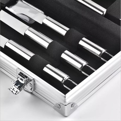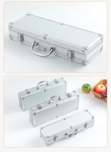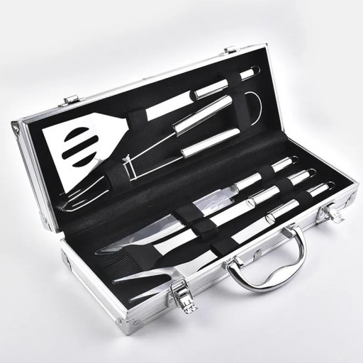 Zestaw akcesoriów grillowych wyposażony jest w aluminiową walizkę ułatwiającą przechowywanie. Walizka wyposażona jest w rzepy ułatwiające utrzymanie porządku.