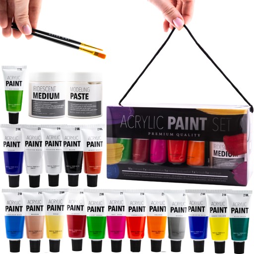 АКРИЛОВЫЕ КРАСКИ БОЛЬШОЙ НАБОР КРАСОК + КИСТИ + СРЕДНЯЯ, ЗОЛОТО МЕТАЛЛИК