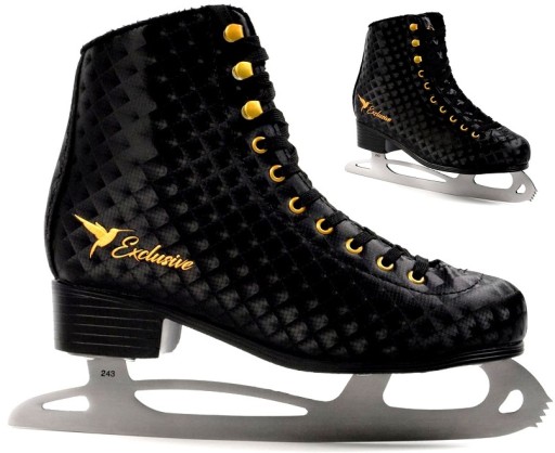 ✨Łyżwy figurowe damskie, sznurowane, model: Exclusive. Klasyczne, kolor czarny, ozdobione delikatnym, złotym nadrukiem.✨