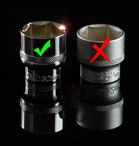 Z prawej strony widzimy zwykłą, typową powszechnie sprzedawaną nasadkę jako super jakościową, natomiast gdy ją porównamy z nasadką z naszego zestawu, nawet laik stwierdzi różnicę w wykonaniu na korzyść naszych precyzyjnie wykonanych nasadek.