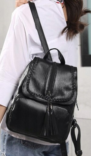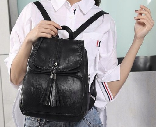 PLECAK DAMSKI SKÓRZANY CZARNY VINTAGE RETRO Z KLAPĄ FRĘDZEL STYLOWY MIEJSKI