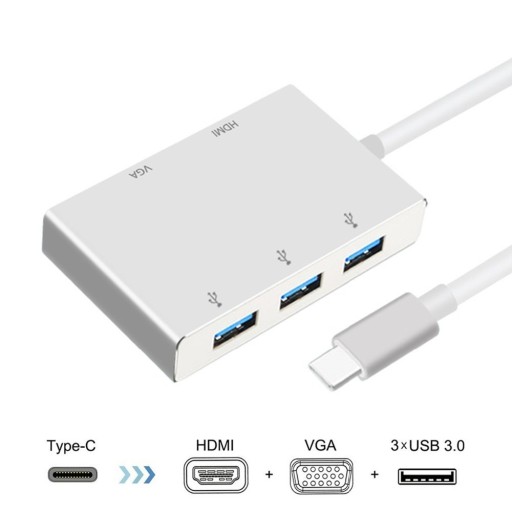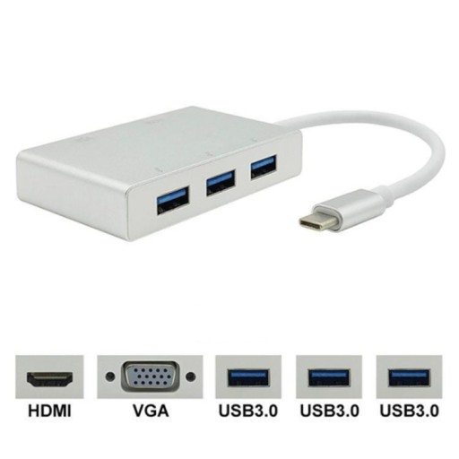 5-in-1. This Multiport Adapter convert your type-C port to 1x HDMI output, 1x VGA output and 3x USB3.0 output. Replaces need for multiple adaptors.