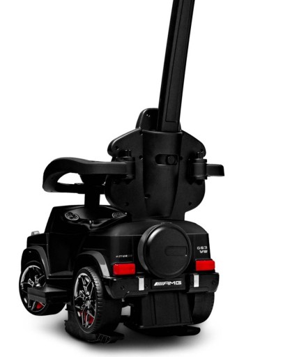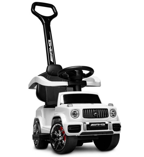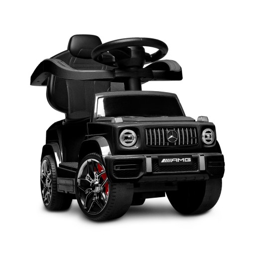 Jeździk dla dziecka z kołyską. Luksusowy Mercedes AMG G63, który posiada rączkę skręcającą kołami, liczne schowki na zabawki. Bezpieczne otwierane barierki boczne 360 stopni. Nowością są również wysuwane podnóżki, które pozwalają na szybką transformację jeździka do popychacza.