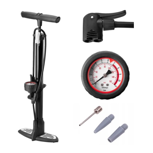 Pompka podłogowa BLACK ALUMINIUM, dzięki której napompujesz wszystkie rodzaje wentyli. Dzięki precyzyjnemu manometrowi dostosujesz ciśnienie do swoich potrzeb. Dołączone igły umożliwią Ci również napompowanie piłek, materacy i dmuchanych zabawek, a dzięki schowkowi na pompce, nigdy ich nie zgubisz.