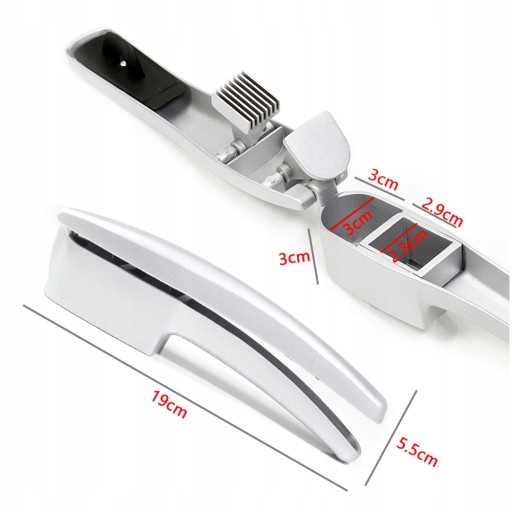 SPECYFIKACJA PRODUKTU: materiał: metal wymiary: 19 x 5,5 x 3 cm kolor: srebrny zastosowanie: praska i nóż do czosnku