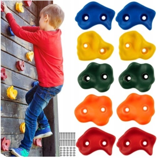 Solidne plastikowe uchwyty przeznaczone do ścianek wspinaczkowych dla dzieci. Uchwyty mają różne kolory i kształty. Każdy z nich ma około 10 cm szerokości, co zapewnia wspinaczowi wygodny i pewny chwyt. Ważne jest również, aby nie miały ostrych krawędzi. Mocowane są za pomocą metalowych śrub i klucza imbusowego, oba znajdują się w zestawie.