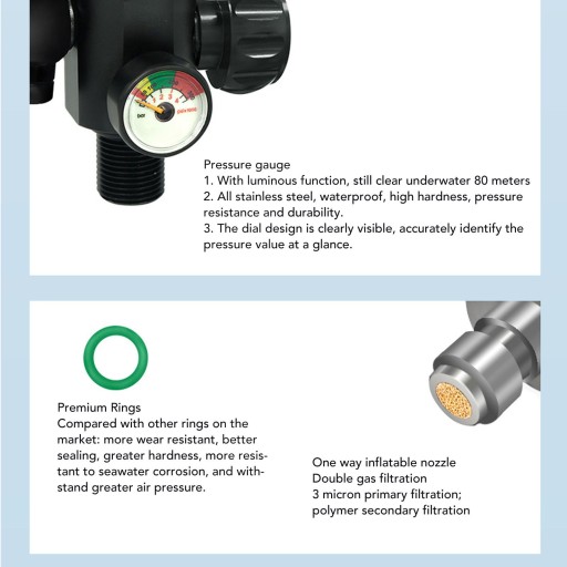 1. Wytrzymay materia: Zawór do nurkowania wykonany jest z najwyższej jakości aluminium, silikonu, ABS i stali nierdzewnej, jest trway i niezawodny, aby zapewnić dugotrwae bezpieczeństwo nurkowania.