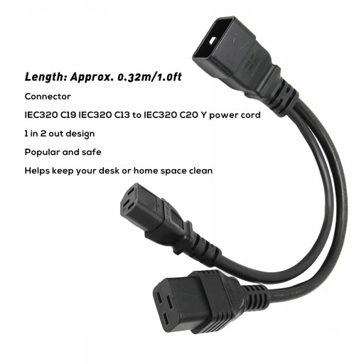 2. Konstrukcja 1 w 2 wyjścia: IEC320 C19 Przewód zasilający IEC320 C13 do IEC320 C20 ma konstrukcję 1 w 2 wyjścia, która jest popularna i bezpieczna, aby pomóc w utrzymaniu czystości na biurku lub w domu.