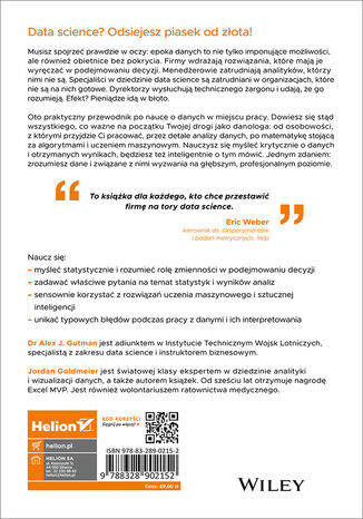 Oto praktyczny przewodnik po nauce o danych w miejscu pracy. Dowiesz się stąd wszystkiego, co ważne na początku Twojej drogi jako danologa: od osobowości, z któ,rymi przyjdzie Ci pracować, przez detale analizy danych, po matematykę stojącą za algorytmami i uczeniem maszynowym. Nauczysz się myśleć krytycznie o danych i otrzymanych wynikach, będziesz też inteligentnie o tym mó,wić. Jednym zdaniem: zrozumiesz dane i związane z nimi wyzwania na głębszym, profesjonalnym poziomie.