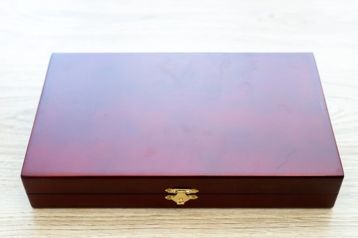Mały komplet gry BACKGAMMON ma wymiary 28x16x5 cm Jest on zatem bardzo poręczny i nadaje się do gry zarówno w domu, jak i w podróży. Kasetka od wewnątrz wykończona jest nadrukiem, a od zewnątrz jest bejcowana na kolor mahoniowy