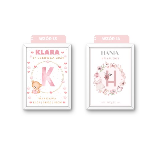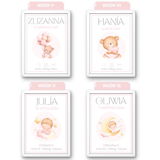 - a następnie w zależności od wybranego wzoru wszystkie dane potrzebne do stworzenia metryczki, np. imię dziecka, miejsce narodzin, godzina narodzin, waga dziecka, długość dziecka