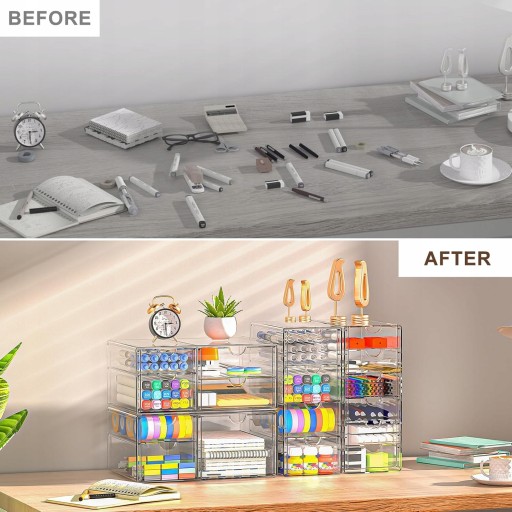 Dzięki zestawowi składającemu się z dwóch organizerów z 7 szufladami, masz teraz idealne miejsce na przechowywanie zarówno kosmetyków, jak i materiałów biurowych.