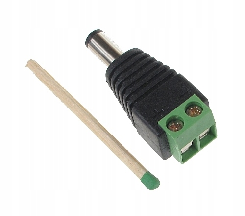 Szybkozłącze na standardowe gniazdo do zasilania kamery. Aby zamontować wtyk wystarczy jedynie odizolować przewody, wcisnąć w zaciski kablowe, a na końcu dokręcić dwa wkręty wkrętakiem krzyżakowym lub płaskim.