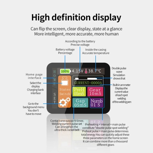 ⭐Możliwość ponownego ładowania, szybkie ładowanie, wbudowany amperomierz spawalniczy, tryb gotowości o niskim zużyciu energii i tryb cichy. ⭐Wysoka wydajność spawania: ⭐Zgrzewarka punktowa ma dwie wbudowane baterie litowe o dużej mocy, a jednoukładowy układ CNC wytwarza silny prąd impulsowy do zgrzewania punktowego. Może mocno spawać blachy stalowe niklowane o grubości 0,25 mm i blachy z czystego niklu o grubości 0,15 mm przy pełnym naładowaniu. Proces spawania jest dokładniejszy, a miejsca spawania są solidniejsze i piękniejsze. ⭐Wiele zabezpieczeń: ⭐zabezpieczenia nadprądowe, zabezpieczenia przed zwarciem, zabezpieczenia przed niskim poziomem baterii, zabezpieczenia przed przegrzaniem, alarmy o przekroczeniu temperatury oraz z funkcją automatycznego wyłączania. ⭐Piór spawalniczy Premium: ⭐Średnica 8 mm, długość 400 mm, drut 8AWG składa się z wielu pasm drutu wysokotemperaturowego o dużej odporności na skręcanie i bardziej czułej pracy. Grube, pozłacane interfejsy z igłami do zgrzewania punktowego z tlenku glinu i miedzi, zapewniające wysoką przepustowość i trwałość prądu ⭐Dane techniczne: ⭐Nazwa: Zestaw zgrzewarki punktowej ⭐Materiał: płytka drukowana ⭐Bateria: 1 * 3,7 V, 5000 mAh ⭐ (w zestawie) ⭐ Wejście: 4,2 V plusmn; 0,05 V ⭐Prąd spawania: 6-800A ⭐Zabezpieczenia nadprądowe: 1,12KA ⭐Napięcie wejściowe: 5,2V, 2,1A ⭐Napięcie wyjściowe: 5V, 2,4A ⭐Opóźnienie spawania: 0,5-2 s ⭐Przedział punktów ciągłych : 0,8-1,2 s ⭐Oszczędność napięcia: 4,0-4,15V ⭐Napięcie wyłączenia: 3,3-3,7V ⭐Jasność ekranu: 5-100,0% ⭐Aktywne wyłączenie: 5-120min ⭐Temperatura alarmu: 50-75℃ ⭐Język: chiński i angielski przełącznik ⭐Temperatura przechowywania: 55 ℃ ⭐Wilgotność przechowywania: 50% RH ⭐Grubość spawu: 0,1-0,25 mm ⭐Rozmiar elementu: 112 * 80 * 30 mm / 4,41 * 3,15 * 1,18 cala ⭐Wielkość opakowania: 180 * 110 * 50 mm / 7,09 * 4,33 * 1,97 cala ⭐Waga opakowania: 390 g / 13,76 uncji ⭐Lista pakowania: ⭐1 * Spawarka ⭐2 * Pióro spawalnicze ⭐1 * Arkusz niklu ⭐1 * Kabel typu C