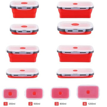 - To 8-pakowe składane pudełko na drugie śniadanie z pokrywką zawiera 4 prostokątne i 4 okrągłe miski, 4 różne rozmiary (350 ml/500 ml/800 ml/1200 ml), 4 różne kolory, a ponadto można je używać w kuchence mikrofalowej, zamrażarce i myć w zmywarce, co ułatwia użytkowanie i czyszczenie.