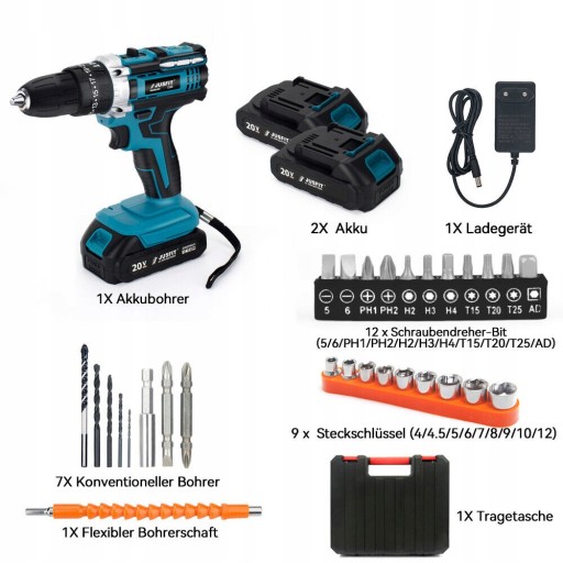 Zestaw wkrętarek akumulatorowych 20 V 3 w 1 akumulatorowa wiertarko-wkrętarka udarowa + 2 aku
