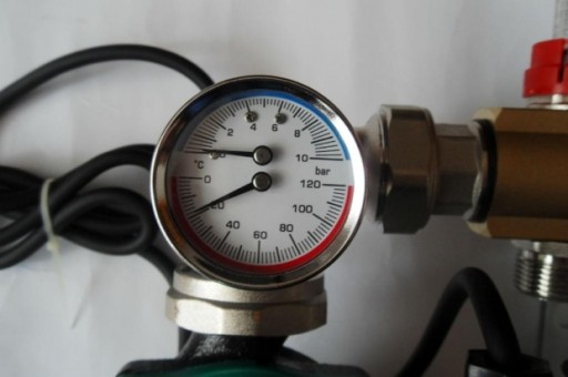 Manometr i termometr do kontroli prawidłowego działania ogrzewania zamontowany na zasilenie nie jak u konkurencji na powrocie ( ważna jest temperatura wpływająca, aby nie doprowadzić do przegrzewów rur, uszkodzeń posadzki itp.)