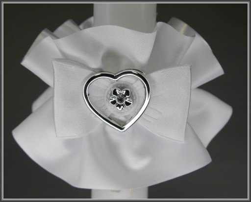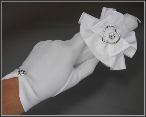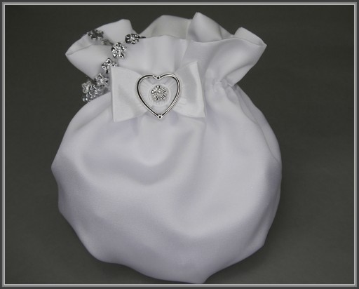 Komplet komunijny: Okapnik na świecę komunijną, rękawiczki białe elastyczne oraz torebka do komunii w kształcie sakiewki wykonana z satyny ślubnej pierwszego gatunku. Torebka ozdobiona została srebrnymi akcentami w postaci serduszka i uroczej rączki. Woreczek posiada sztywną wkładkę która pomaga w zachowaniu jego kształtu nawet po obciążeni. Na pozostałych aukcjach można kupić każdy element zestawu osobno.