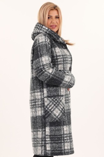 Produkt uszyty w Polsce - stylowy płaszcz damski w kratę w odcieniach szarości i bieli