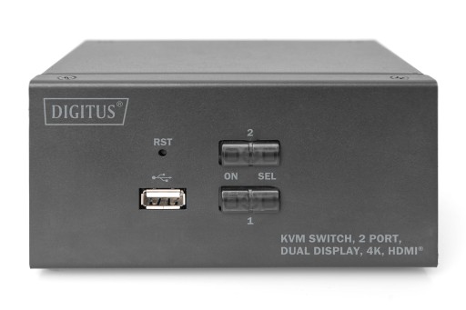 Dzięki 2-portowemu przełącznikowi KVM DIGITUS do obsługi dwóch monitorów można obsługiwać dwa komputery PC z obsługą 4K z jednej kombinacji klawiatury USB i myszy. Za pomocą jednego przycisku lub klawisza skrótu można łatwo przełączać się między dwoma komputerami i oszczędzić sobie kłopotu z podłączeniem kabli. Wyjście do dwóch monitorów odbywa się poprzez dwa wyjścia HDMI na tylnym panelu. Sygnały audio z mikrofonu i głośnika również mogą być przełączane. Ponadto na przednim panelu znajduje się port USB, który może być używany do innych urządzeń peryferyjnych, takich jak pamięci USB lub zewnętrzne dyski twarde w obu komputerach. Podłączone urządzenia peryferyjne są przypisane do aktywnego komputera PC. Diody LED z informacją o stanie na przednim panelu przełącznika pokazują przez cały czas aktualną konfigurację. Wyłącznik uzupełnia solidna metalowa obudowa.