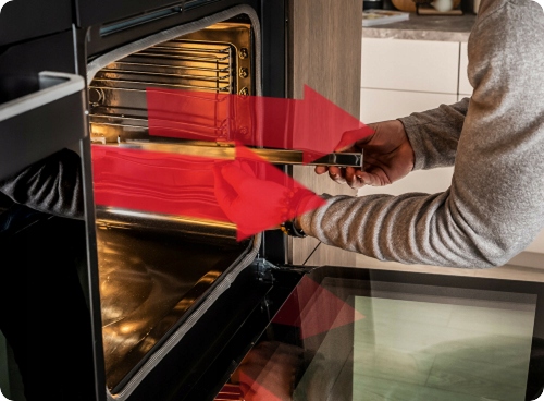 Wysuwając rozgrzaną blachę z gorącą potrawą łatwo o poparzenie i ryzyko upuszczenia blachy. Nie w piekarnikach Amica! Wszystko za sprawą prowadnic. Dzięki nim możesz w pełni bezpiecznie, bez ryzyka poparzenia, wsunąć i wysunąć nawet rozgrzaną i mocno obciążoną blachę.