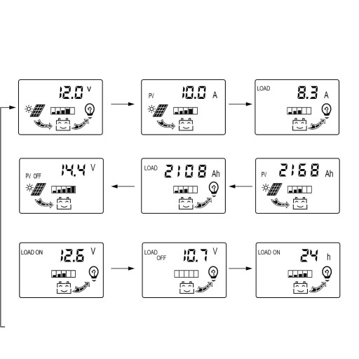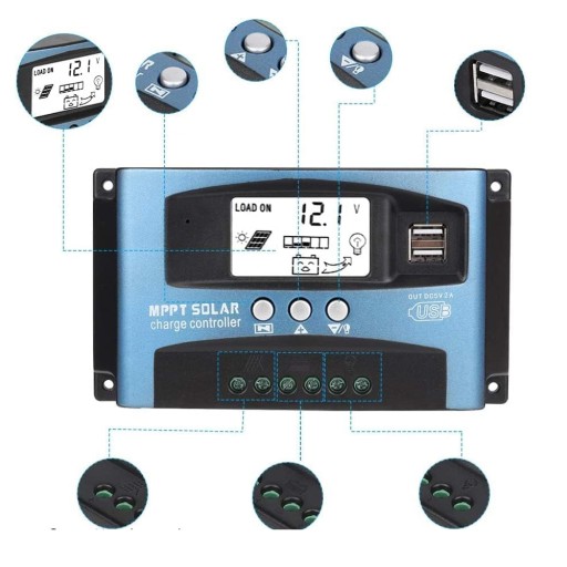 ⚡Ten kontroler ma automatyczną regulację 12 V/24 V. Najpierw podłącz akumulator, a następnie podłącz panele słoneczne. Używając go po raz pierwszy, upewnij się, że akumulator ma wystarczające napięcie, aby sterownik mógł rozpoznać właściwy typ akumulatora.
