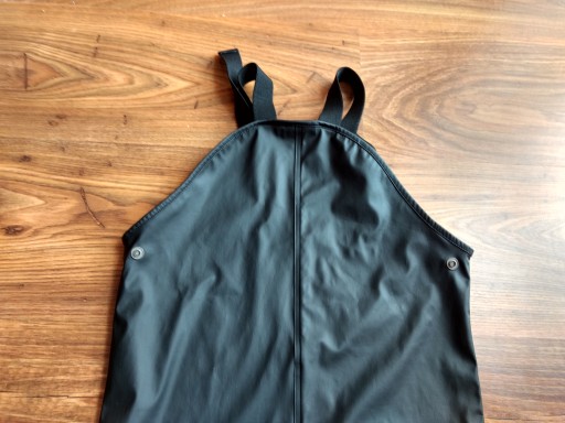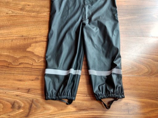 czarne nieprzemakalne przeciwdeszczowe i przeciwśniegowe spodnie na regulowanych szelkach z gumy z klamrami zatrzaskowymi w pasie po bokach napy regulujące szerokość dół nogawek ściągany gumą dodatkowo regulowane i odpinane gumy na buty stan dobry-przetarcie na kolanie widoczne na zdjęciach wymiary szer w pasie max-36 cm szer po zapięciu nap -29 cm dł bez szelek-71 cm dł nogawki od kroku-32 cm