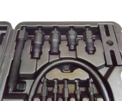 Zestaw zawiera miernik ciśnienia do 70 bar (1000 PSI) z przewodem, szybkozłączem i zaworem zwalniającym, 4 adaptery montowane w miejscu wtryskiwacza, 9 adapterów montowanych w miejscu świecy żarowej, jeden adapter uniwersalny oraz mocowanie typ H.