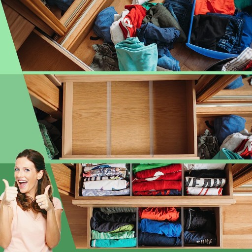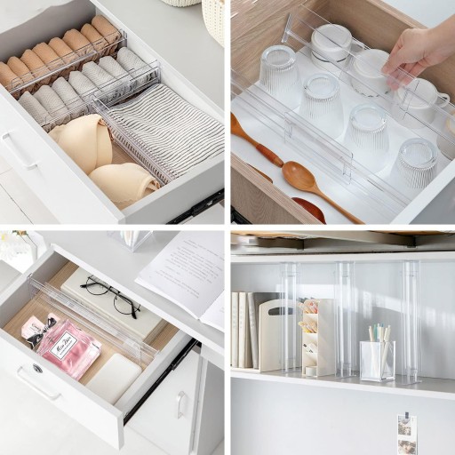 - -Szybki i łatwy montaż, nie wymaga żadnych narzędzi ani sprzętu. Wystarczy przykleić taśmę dwustronną (w zestawie) na przegrodzie, oderwać taśmę, umieścić ją w odpowiedniej pozycji, a następnie przykleić przegrodę do przegródek szuflady, rozciągnie się do pożądanej długości i można ją trzymać mocno w szufladach.