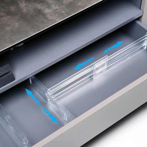 Oba przegrody szuflady przegrody można rozszerzyć na zewnątrz, rozszerzając się od 12,13 cala do 21,5 cala, 3,2 cala wysokości. Regulowane przegrody szuflad pomagają uporządkować rzeczy i utrzymać szuflady w porządku przez cały czas.