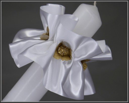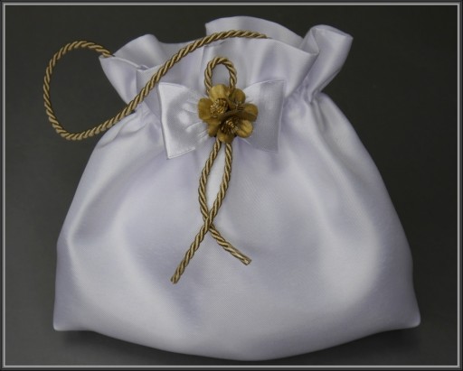 Torebka komunijna wykonana z satyny atłasowej odszytej na matową stronę. Ozdobiona sznureczkiem i kwiatkami w kolorze antycznego złota + okapnik na świecę komunijną. Na pozostałych aukcjach każdy ten produkt można kupić osobno.
