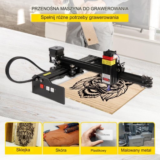 Moduł laserowy pozwala na grawerowanie i cięcie różnych materiałów, takich jak drewno, papier, skóra, stal nierdzewna, ceramika i inne. Możliwość cięcia materiałów, takich jak papier, płyty drewniane, skóra, i akryl o grubości do 2 mm, czyni tę maszynę niezwykle wszechstronnym narzędziem dla różnych projektów DIY i profesjonalnych.