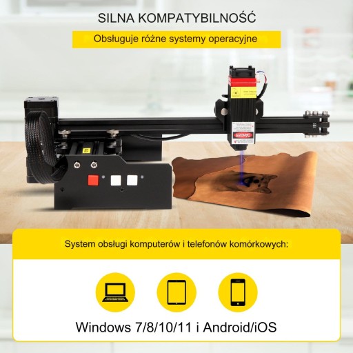 Maszyna jest kompatybilna z systemami PC i mobilnymi, w tym Windows 7/8/10/11, iOS oraz Android. Obsługuje najnowsze oprogramowanie układowe, takie jak GRBL f1.1, VevorWorks, LaserGRBL i Lightburn, co czyni ją wszechstronnym narzędziem dla szerokiego zakresu zastosowań.