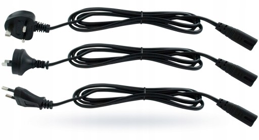 W zestawie znajdziemy zasilacz z końcówka do kompresora oraz 3 przewody zasilające z różnymi typami wtyczek europejska oraz 2 angielskie z uziemieniem i bez uziemienia.