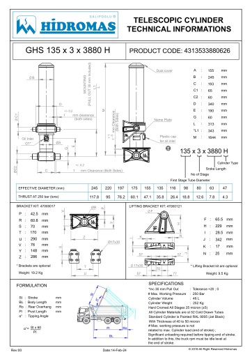Siłownik teleskopowy hydrauliczny frontowy do wywrotu, naczep 3880 mm